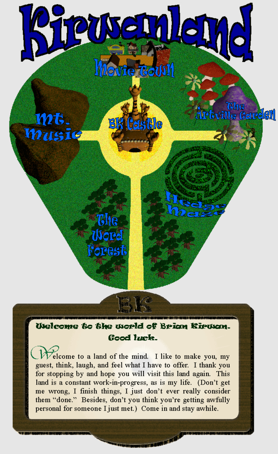 Kirwanland was my main website before BrianCreates.com became the main source of all things Brian. Kirwanland was conceived as a map of different lands where you could click on each land and be taken to the different things I created. There was The Artville Garden, Movie Town, BK Castle, The Word Forest, and Mt. Music. The map looked remarkably like a map of Disneyland. I had a hedge maze in the middle of the map that, if you clicked on the right spot, would take you to a secret behind-the-scenes area of the site. This was not the only version of the website requiring people to click on images to go to different parts of it. Eventually, I figured out people just want to go to the area of the website they were interested in and they really don’t want to explore an image to figure out how it works. I thought it made the site interesting, but it only made it frustrating for visitors. As a treat for reading to the end of this Thoughts paper, I present to you the map of Kirwanland with the included dedication.